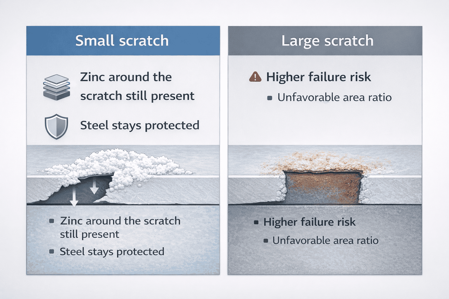 ถ้ารอยขีด เล็ก/แคบ และรอบ ๆ ยังมีซิงค์อยู่ วงจร sacrificial ยังทำงานได้ในระยะสั้น-กลาง เพราะซิงค์รอบ ๆ จะค่อย ๆ สึกเพื่อปกป้องจุดที่เหล็กเปิดผิว
